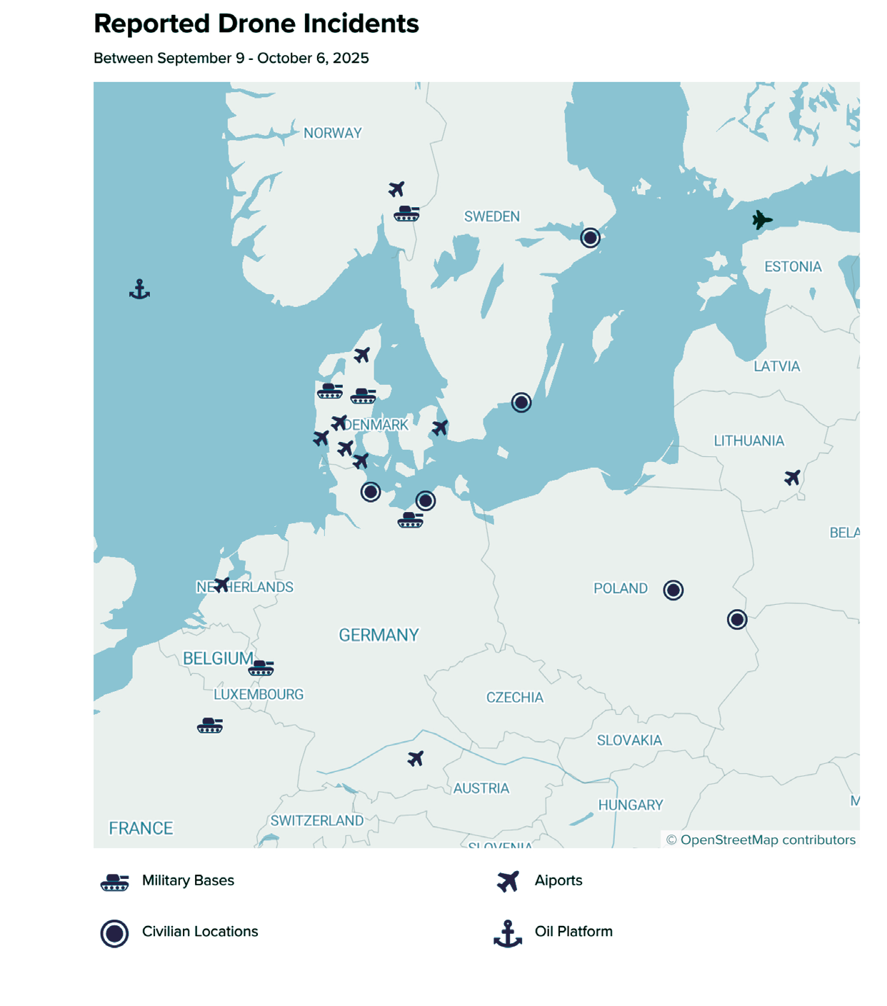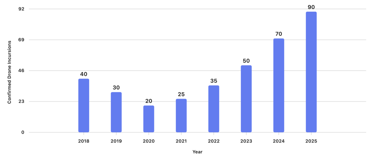 Source: (Data accurate to 10/11/2025), Source Map: UK Airprox Board (UKAB), EASA (European Union Aviation Safety Agency), Eurocontrol and incident-specific reports from major disruptions (e.g. Gatwick 2018, Munich and Vilnius 2025) published by national aviation authorities. These sources do not publish a single consolidated dataset, so the numbers represent confirmed airport incursions extracted form these reports, not all drone sighting or Airprox events.